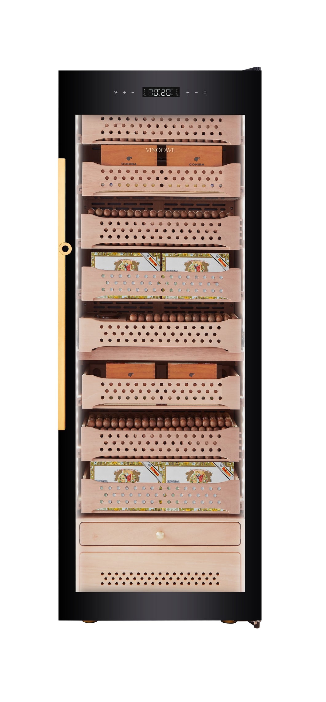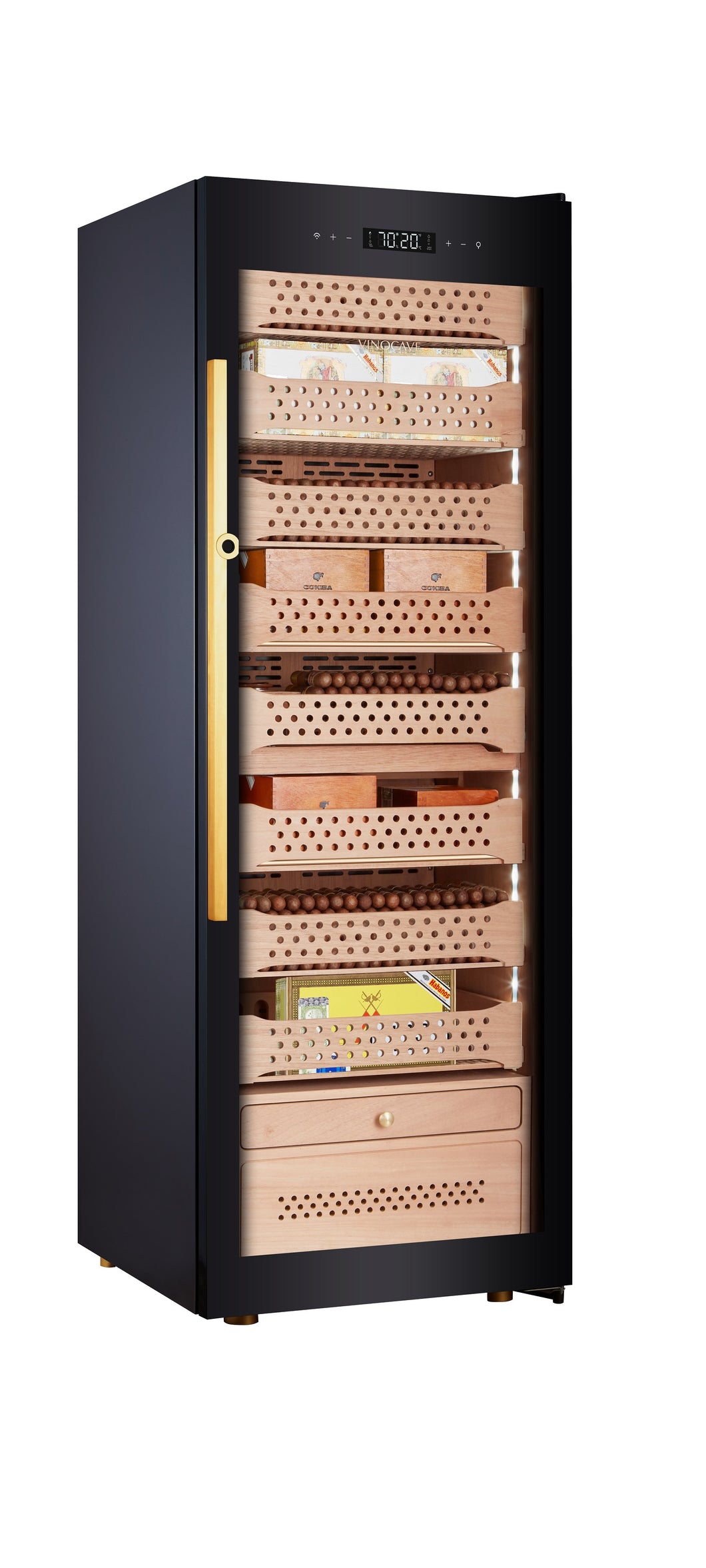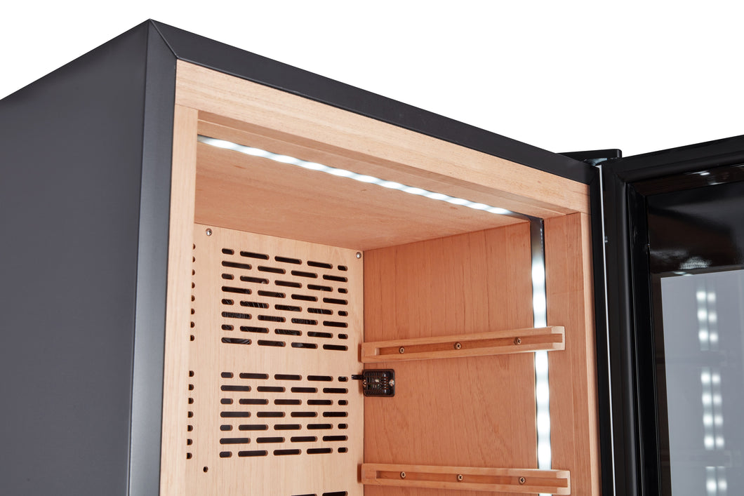 Afidano 1500 Ct Cigar Humidor boasts a sleek and contemporary design, featuring a low-E glass door that not only showcases your cigars with elegance and lets you easily scan the shelf to see what's inside but also provides UV protection to shield them from harmful light exposure. The touch control panel adds a touch of convenience, allowing you to effortlessly manage the internal environment with precision without opening the door and disturbing the temperature and humidity.