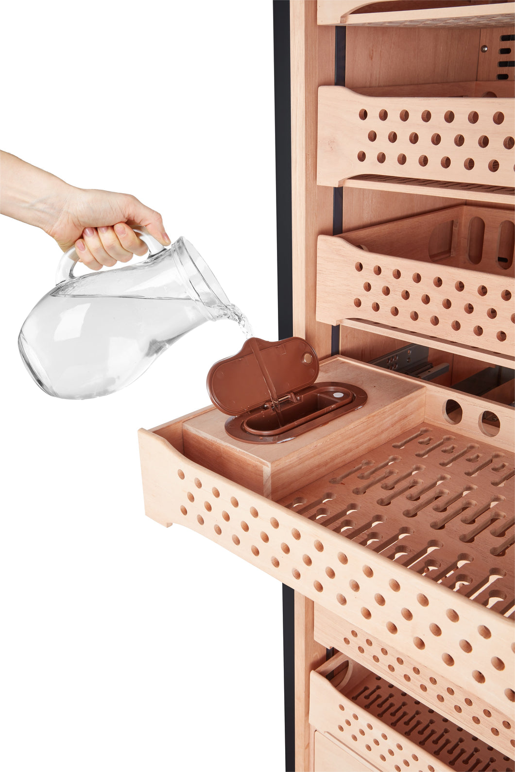 Afidano 1500 Ct cigar humidor prompts you at the right time to replenish the water, guaranteeing a stable humidity level internal environment. Also it will "Dee" sound when you refill too much water. Ensuring that you can easily keep the humidor in optimal working condition.